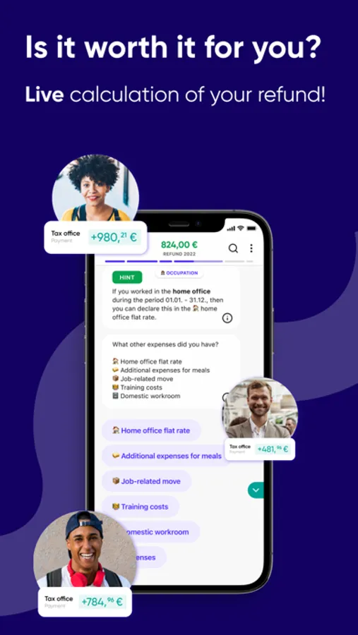 Answer understandable questions in the app, without any tax knowledge needed. Many tips and simple help texts support you with your tax return in the app or on the web.