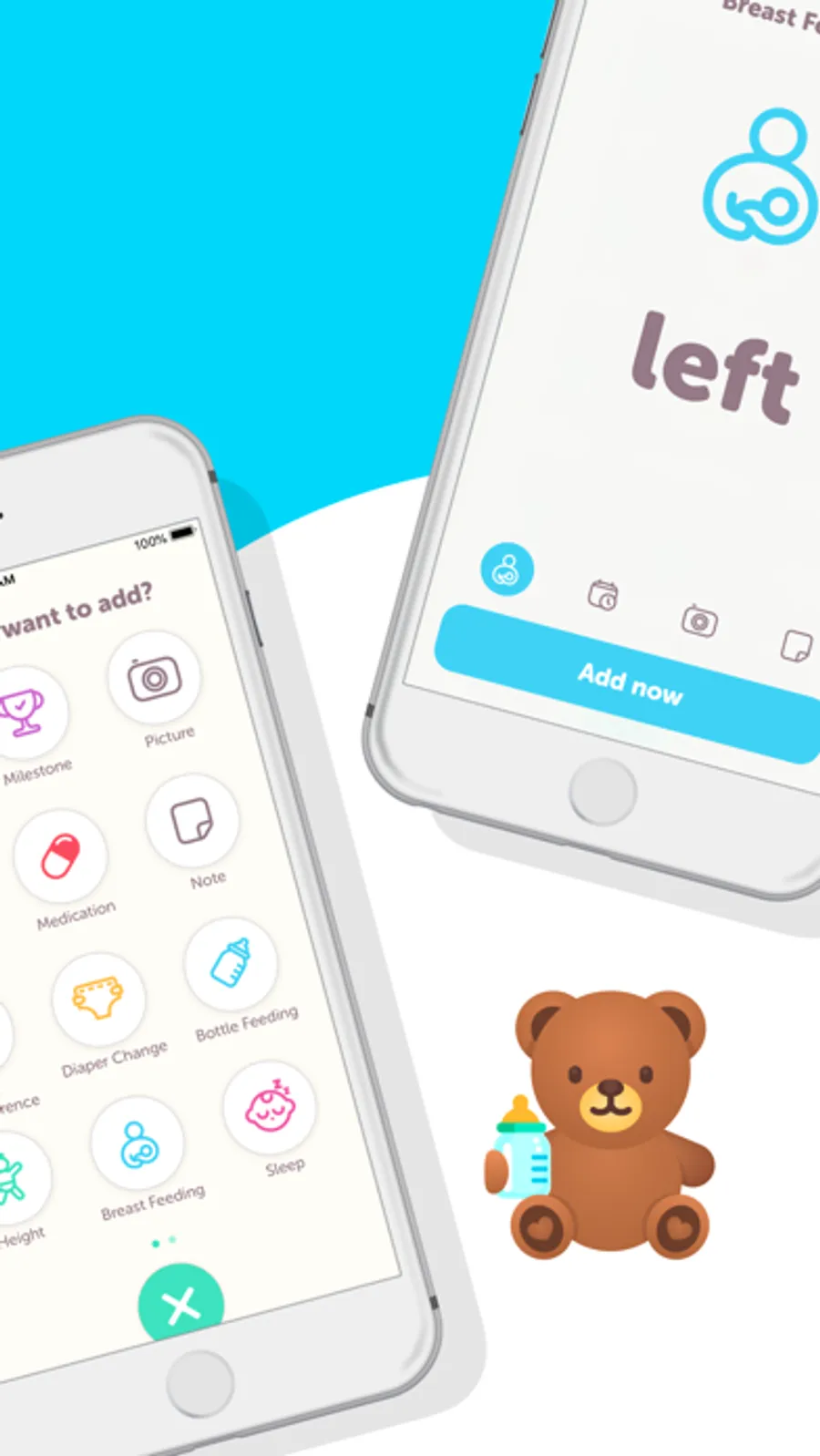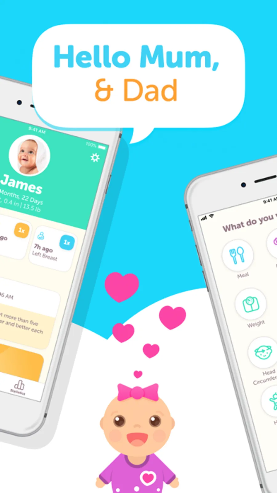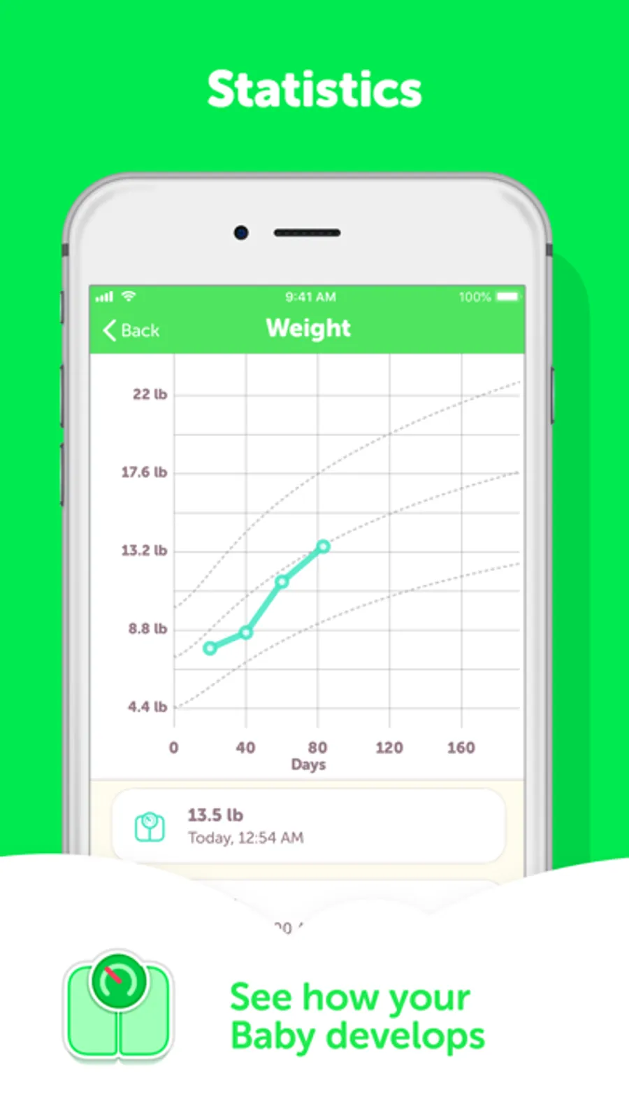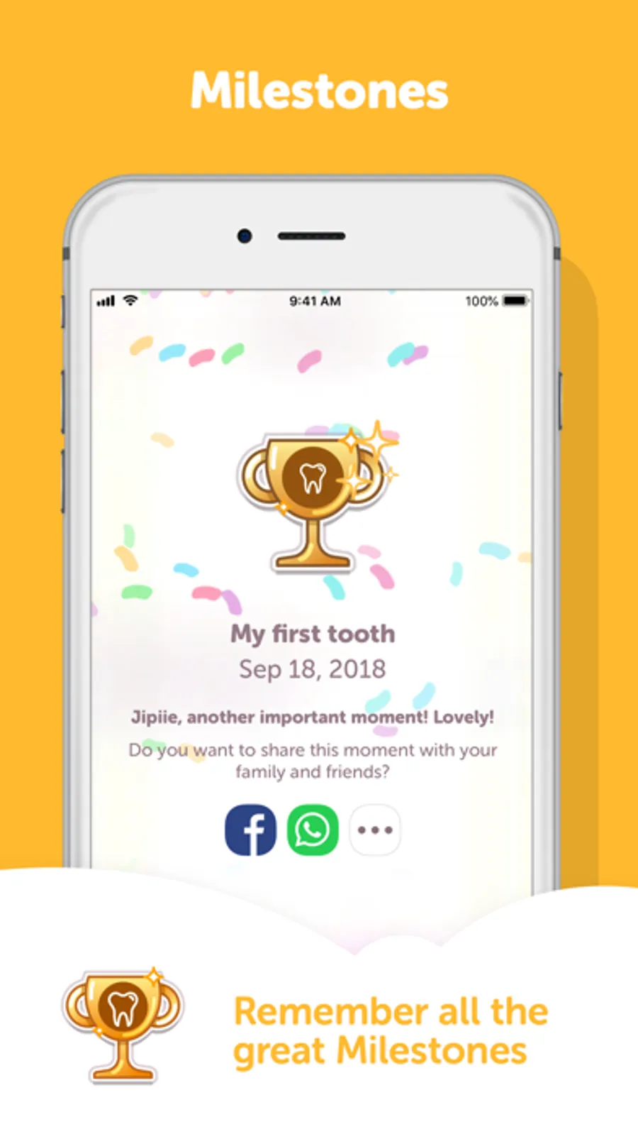 Add height, weight and head circumference, to see how your baby develops. Remember important Milestones like the first Tooth or the first smile and share it with your Friends and Family.