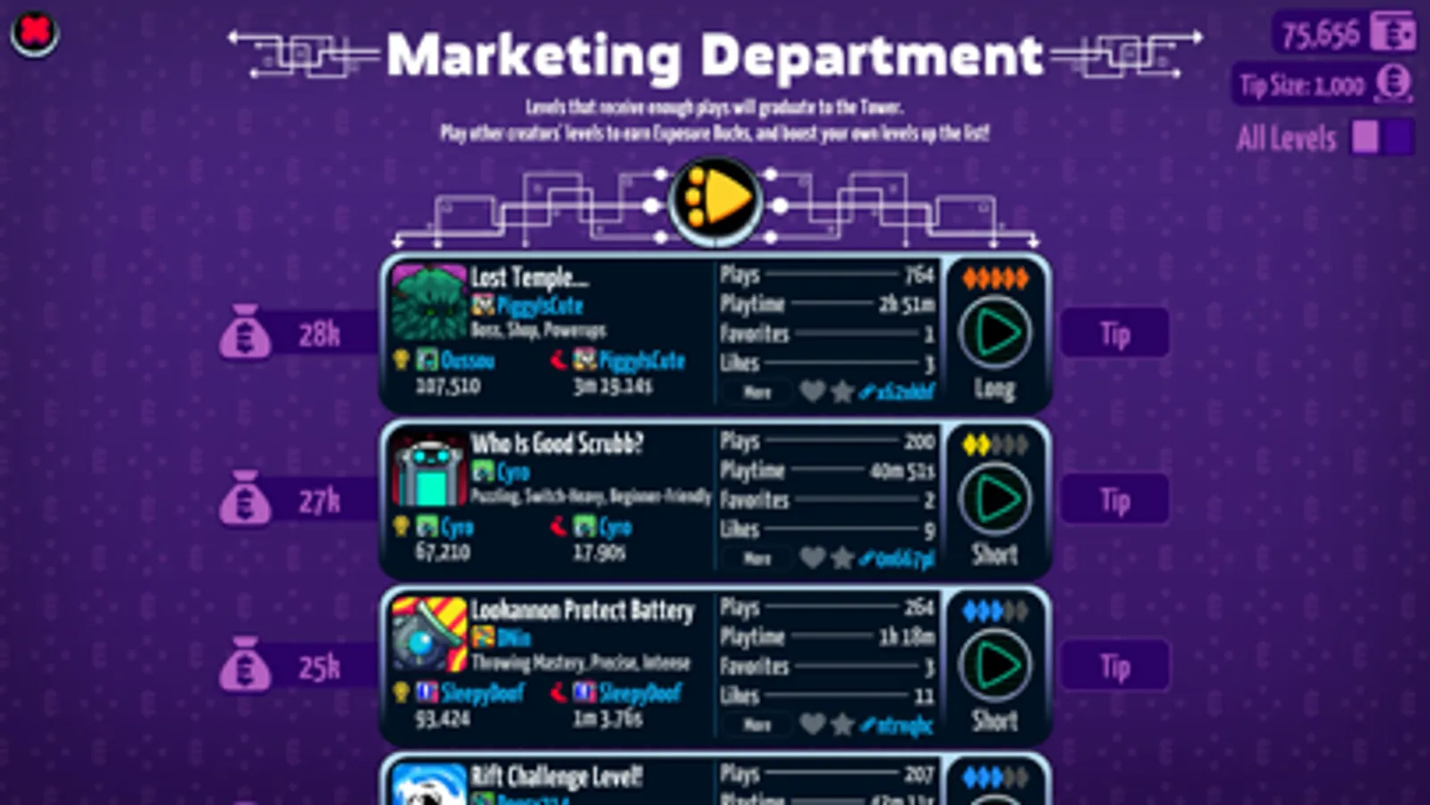 + Gain a following! Publish your Level to the entire world and see your Play Time, Attempts, and Followers stack up. With robust search and curation, Levelhead makes collecting followers and playing endless user generated content from around the world a breeze. Plus, the Marketing Department lets you push your Levels to the top of the charts just by playing the game, meaning you don't already have to be famous to get your Levels played!