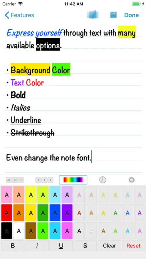 • Bold, Italics, Underline, Strike text and more highlighting colors.
