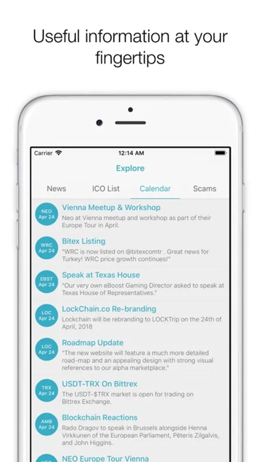 • "Explore" section with News, ICO List, Calendar with upcoming events and Scam List