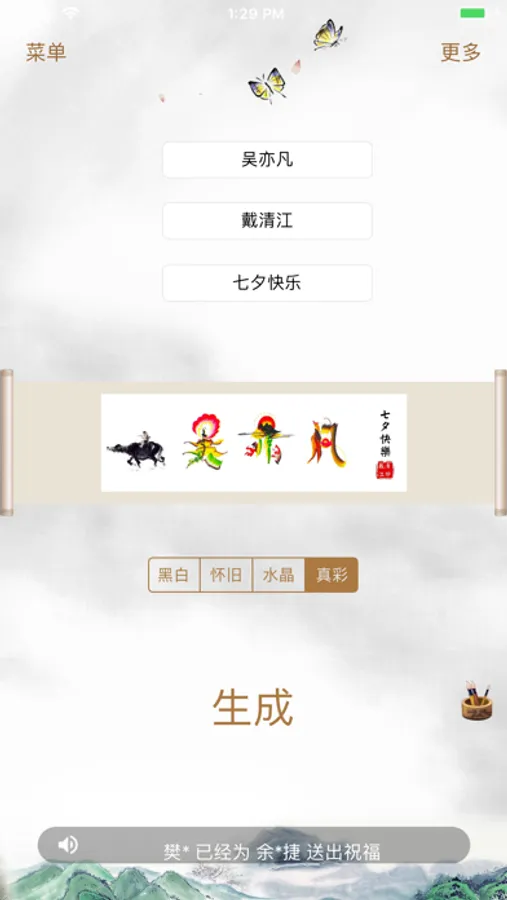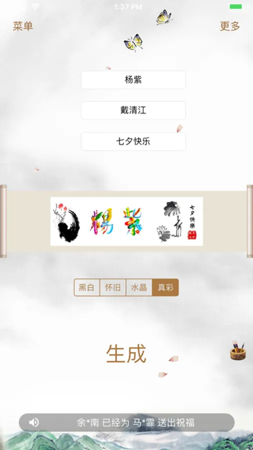 花鸟字,又叫龙凤字,又因为常常用于书写某个人的姓名,故也有叫做名字作画。它利用特制的多彩画笔,一气呵成,能快速绘出简洁的物形、螺线等代替文字的笔画,利用字里藏画的结构形式,巧妙地融字、画于一体,表达出吉祥喜庆等多种效果,同时又增强文字的意趣及视觉的吸引力。既有传统国画的干净利落,又有西洋画的鲜艳色彩。飞龙、舞凤、花草、小鸟、蝴蝶、鱼儿相映成趣,令人百看不厌,有“书法家难起笔,画家难润色”之说,是中华民族历史文化百花园中的一枝奇葩。
