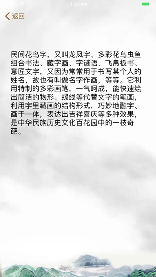 花鸟字的笔画多用花鸟图案而得名,在写字的基础上,把字的笔画用花、鸟、鱼、草、虫、山、水等图案代替,把汉字写得美轮美奂。花鸟字以基本字形组成,集书法绘画为一体。