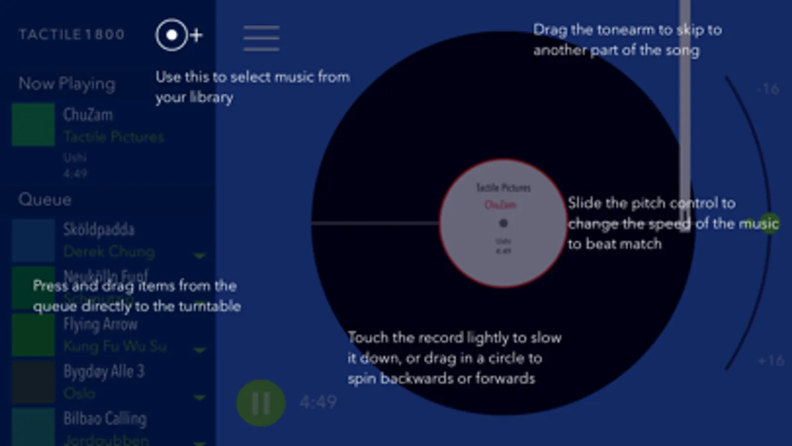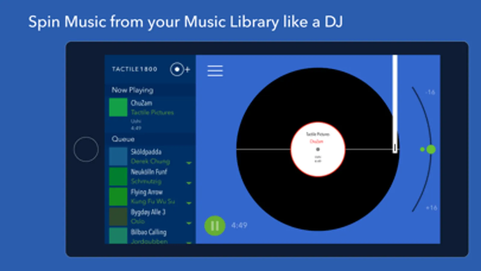 With a clean, minimal interface, it’s a simple and fun way to play and spin your music like a DJ - speed up, slow down and control the record directly with your hands, and use the needle to skip around.