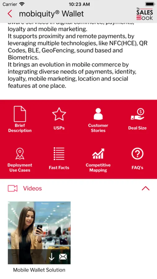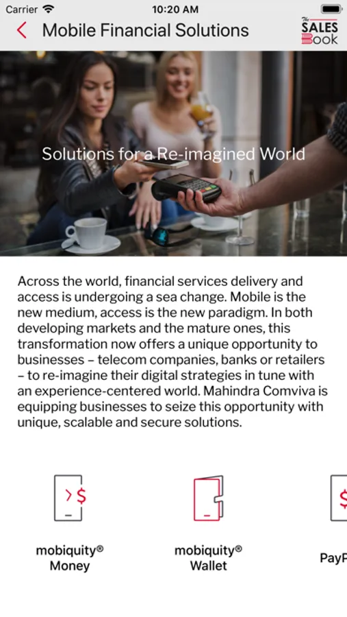 We live highly digitized lives and leverage smartphones for all our needs. Being mobile enables work on the move. The Sales Book APP functions as an invaluable channel to access all information related to Mahindra Comviva’s products and services and will help you in providing world class service to end customers. It is a smartphone based ready-reckoner. The application provides a comprehensive overview of the extensive portfolio of solutions - mobile finance, digital content, analytics, messaging, mobile data and managed VAS services. It also provides immediate access to all collaterals such as videos, infographics, whitepapers, flyers and blogs. The app also provides the daily dose of industry news – all at one place!