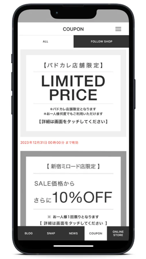 パドカレ全店で使えるアプリ限定クーポンを配信します。