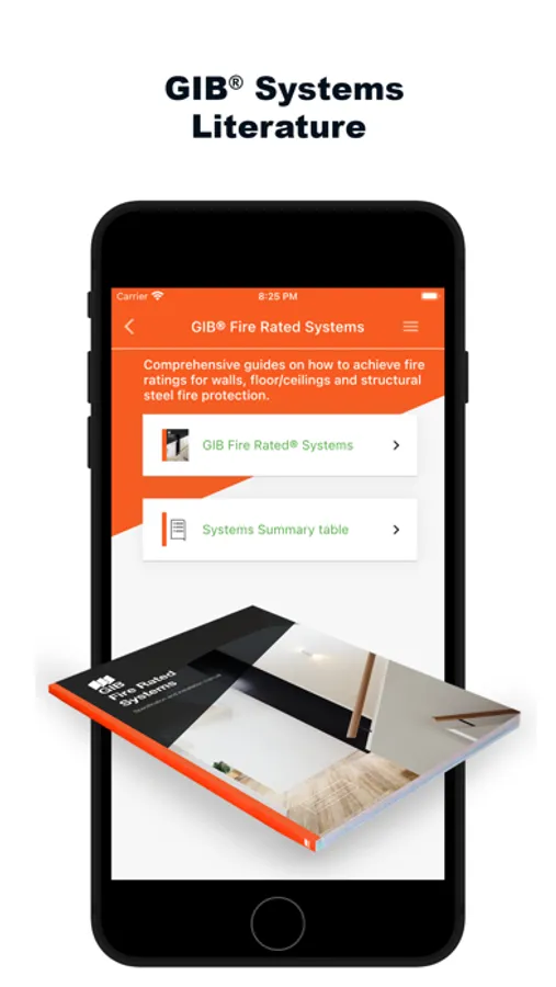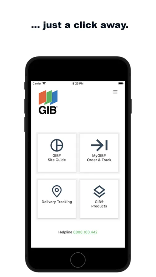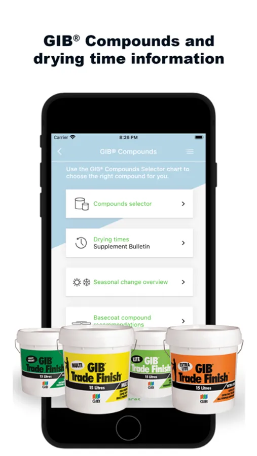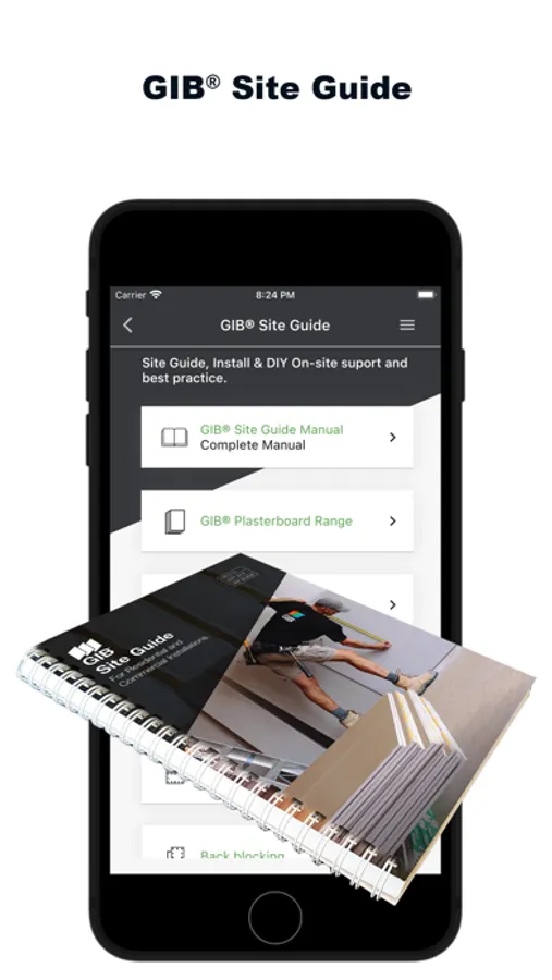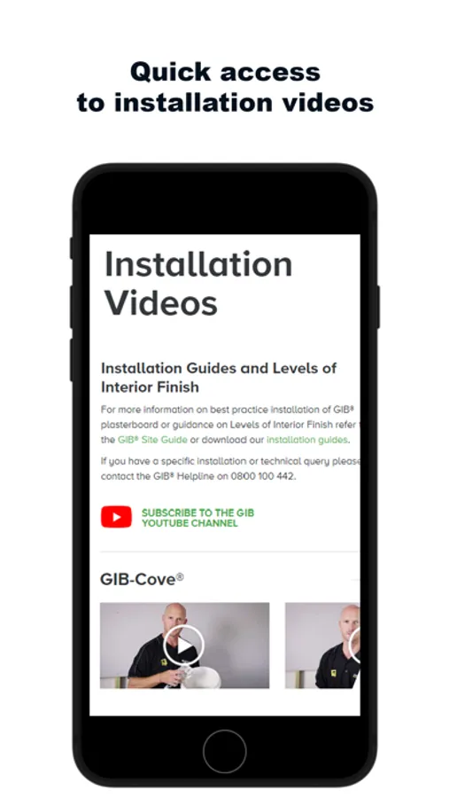 Menu options include GIB® Site Guide information, installation videos, and 'Best Practice' recommendations. Moreover, it also provides quick access to GIB® compound information, including drying times, and GIB® system literature.