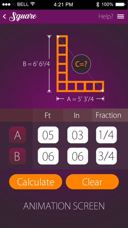 By entering in the two dimensions of your length and width, The Square App will calculate the exact dimension in Feet and Inches of the hypotenuse the right triangle. This eliminates the need for the multiple steps required in using the Pythagorean Theorem, and the conversions from inches and decimals. By using the simply illustrated example on the home page of the app and inserting your specific project dimensions, you can easily calculate your square dimension.