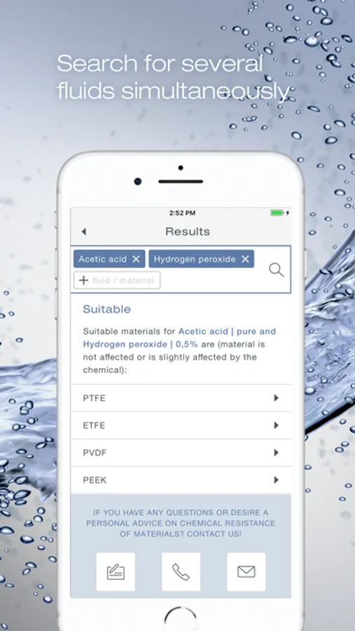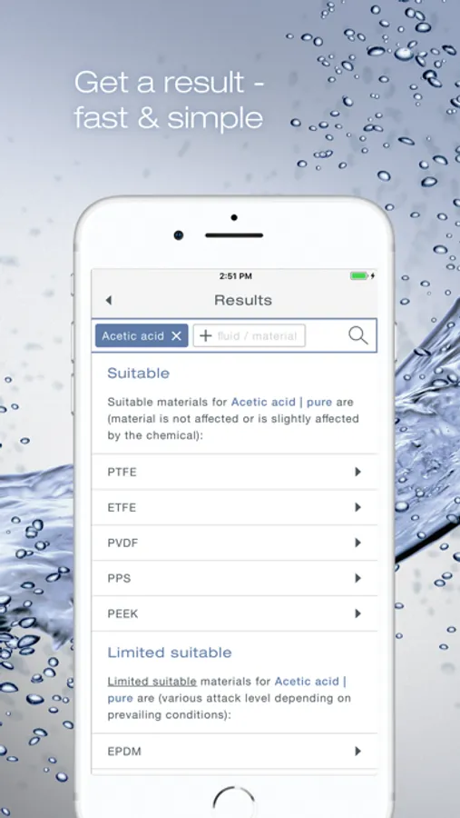 The Bürkert resistApp helps you as an interactive chemical resistance chart to find compatible materials for a multitude of media. It simplifies the selection of suitable materials when using Bürkert products.