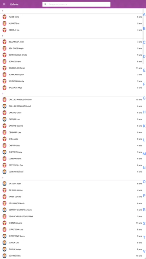- De retrouver facilement les enfants grâce à de nombreux filtres de sélection, un moteur de recherche, ainsi qu’un accès rapide par ordre alphabétique.