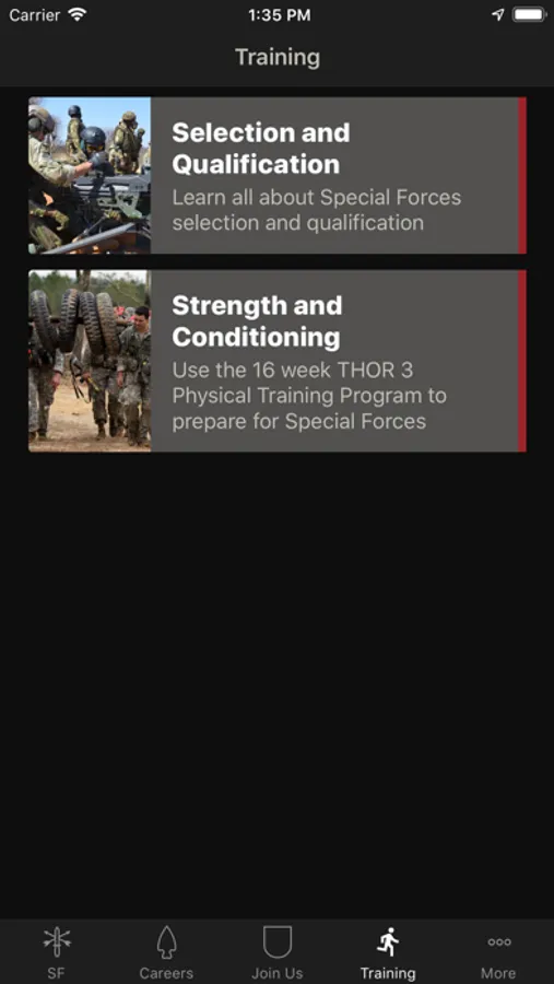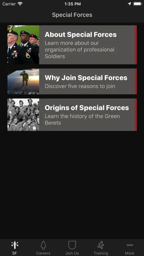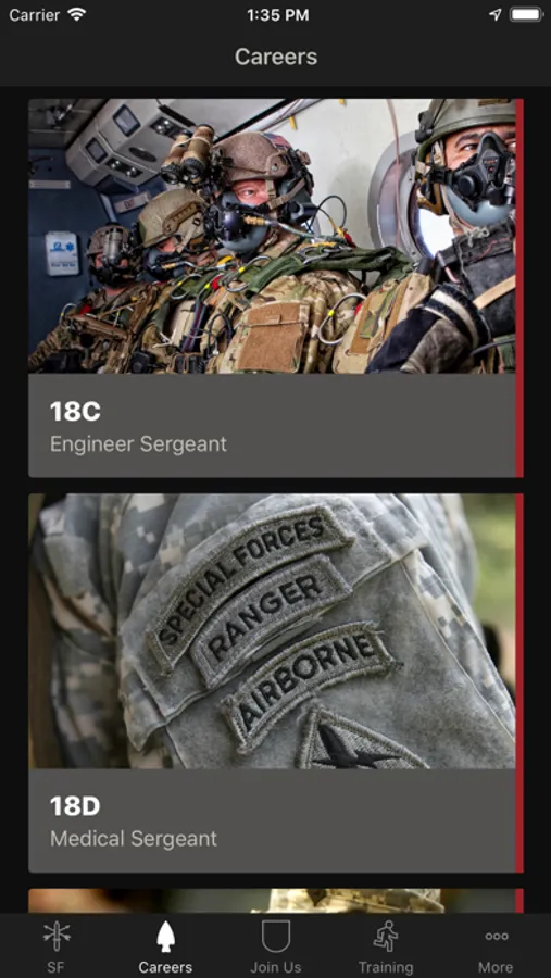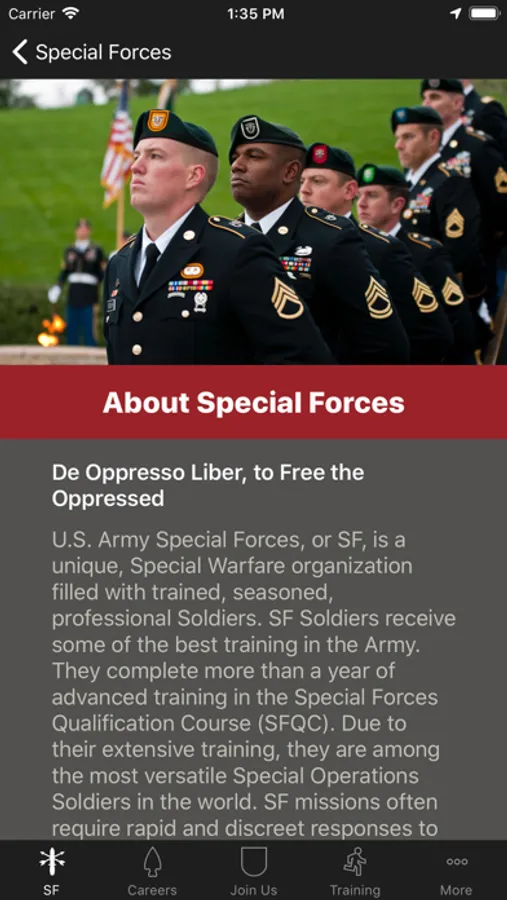 Special Forces (SF) are elite teams consisting of mature, intense, highly-trained operators. SF Operators receive specialized training in advanced weapons, language, demolitions, combat medicine, military free-fall, and advanced combat tactics. Today's quiet professional operates in autonomous environments as the most trusted force in America's Army.