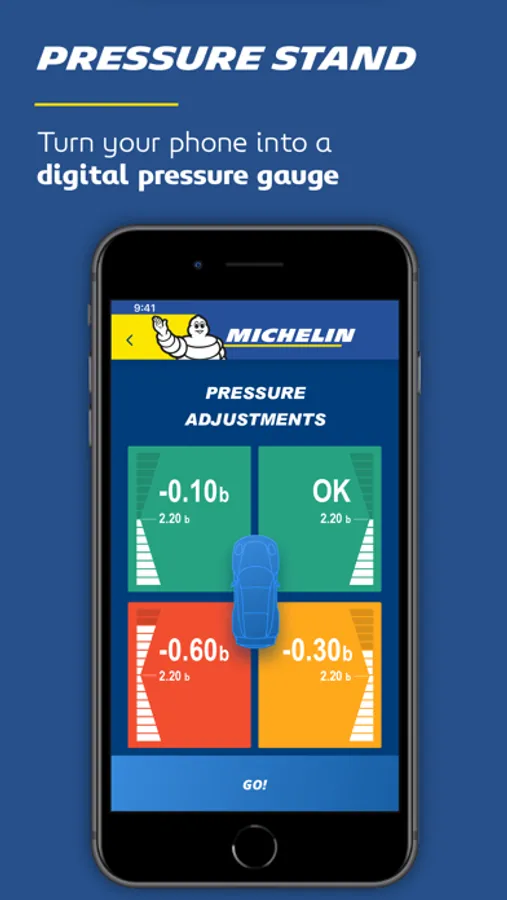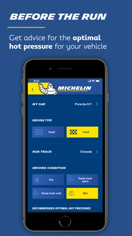 -       Before the run, the app gives you advice on the best pressures for your vehicle and your conditions of use: on road or circuit and in dry, wet or damp conditions