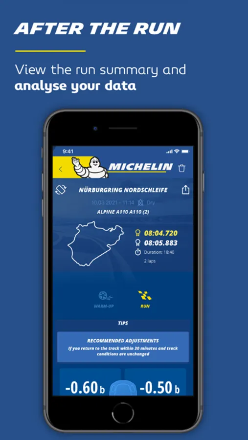 -       After the run, the collected data allows you to analyse and relive your driving session. Thanks to the application, your phone become a digital manometer to take full advantage of personalized pressure advice. You will then be able to get back on the track in the best possible conditions.