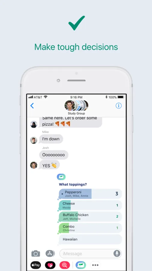TinyPoll is a quick and fun way to make decisions with your friends. With just a couple of taps, you and your friends can easily decide between pizza or tacos – all without ever leaving iMessage. Choose the perfect movie time, get feedback on your outfit, or even settle age-old debates like if that dress is actually blue or white. The possibilities are nearly endless!