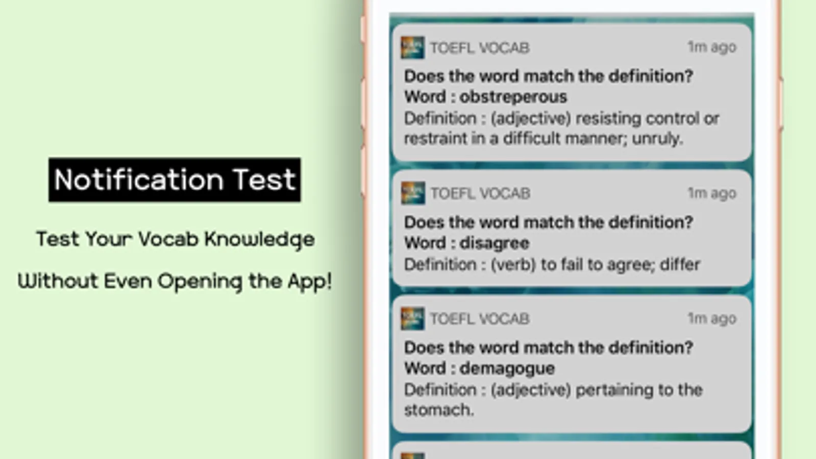 7. PUSH NOTIFICATION. Our team really doubled down on this feature. You can set push notification for all 2400 words, words just in your My Words, or all words in Test Results. Also, you can add push notification to take tests. Push notification is a very unique feature that no other people really focus on.