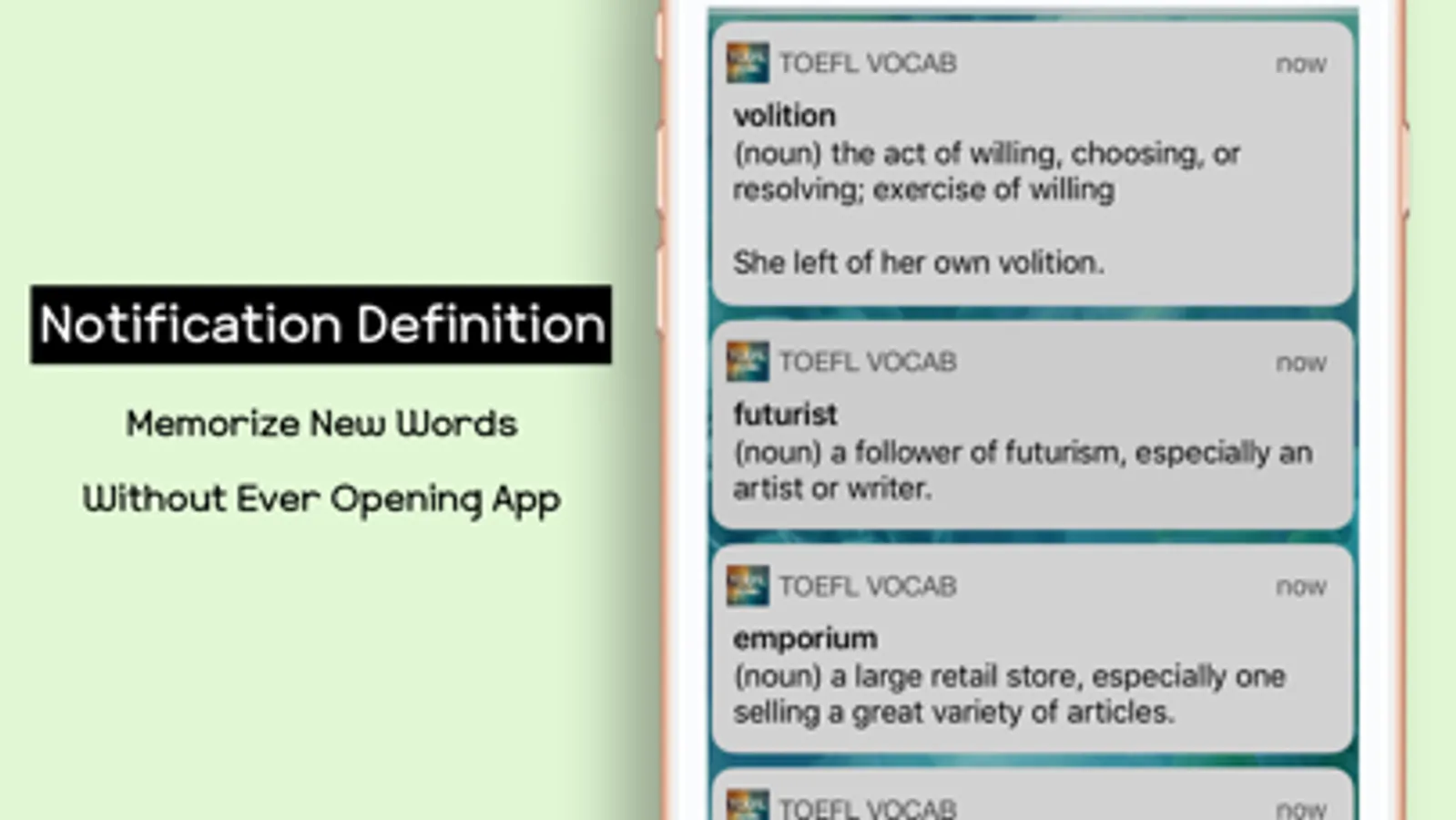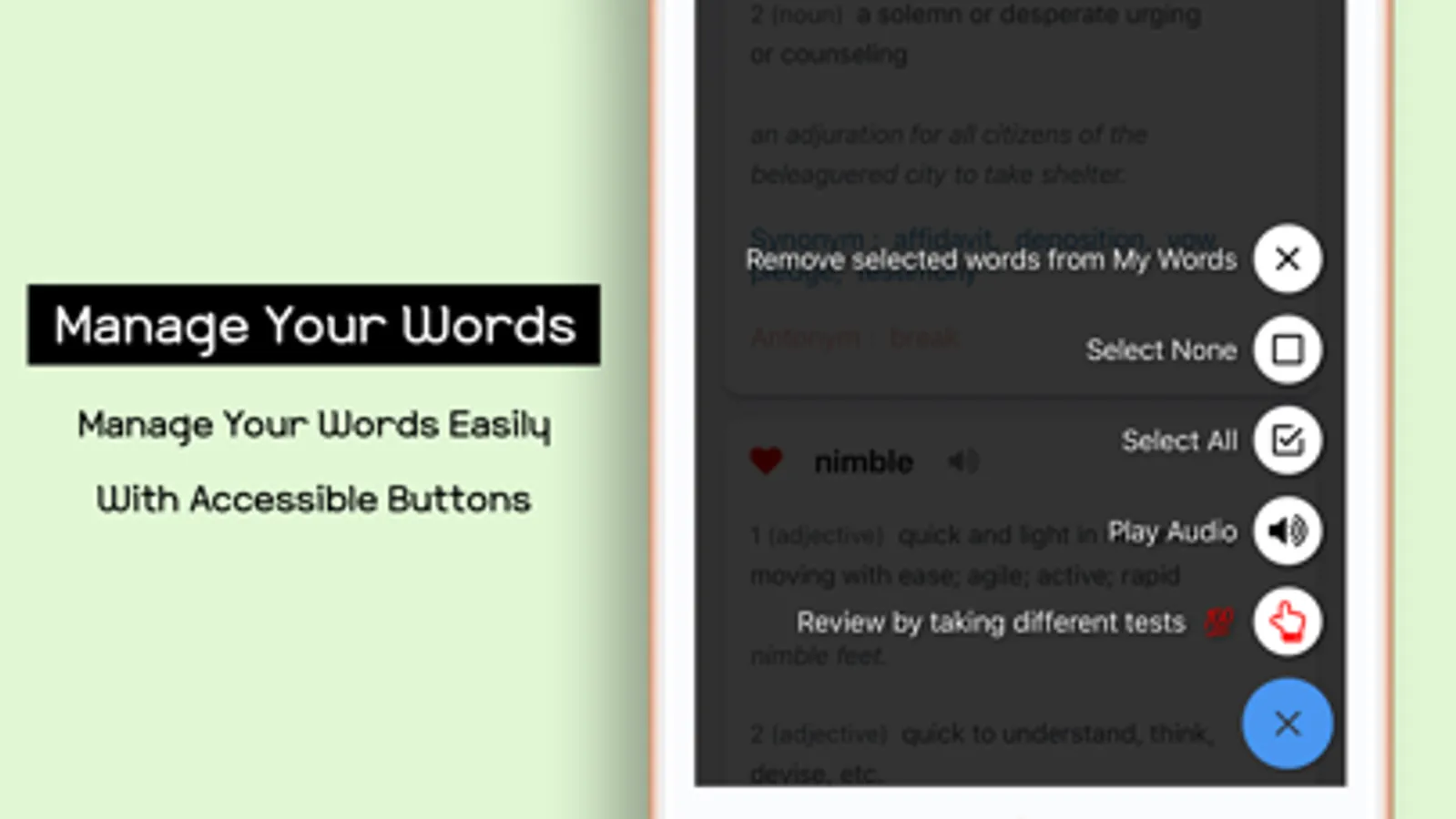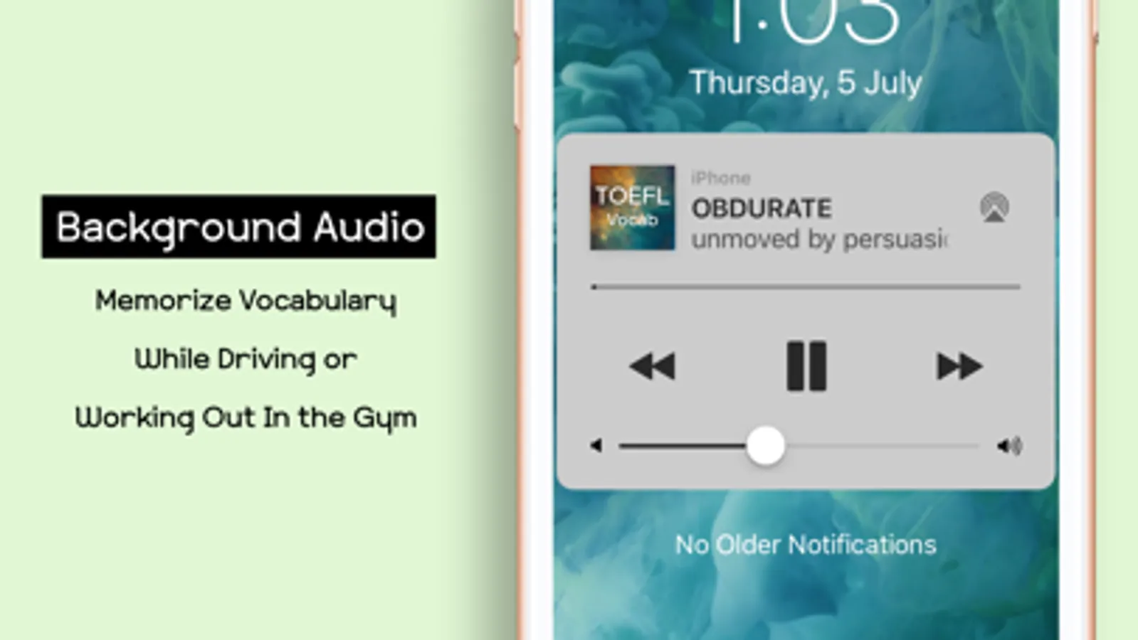 4. BACKGROUND AUDIO. Our users love our Audio features.The app reads the word, definition, and example. Even in the BACKGROUND. You can turn the audio on in the background, and memorize new vocabulary while driving, exercising, cooking, etc.