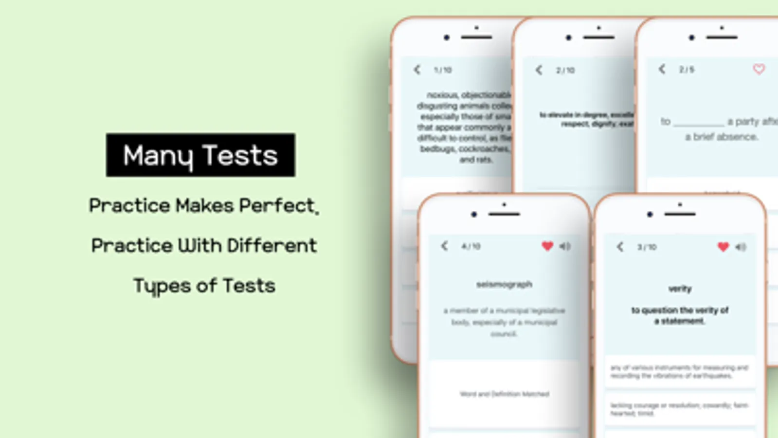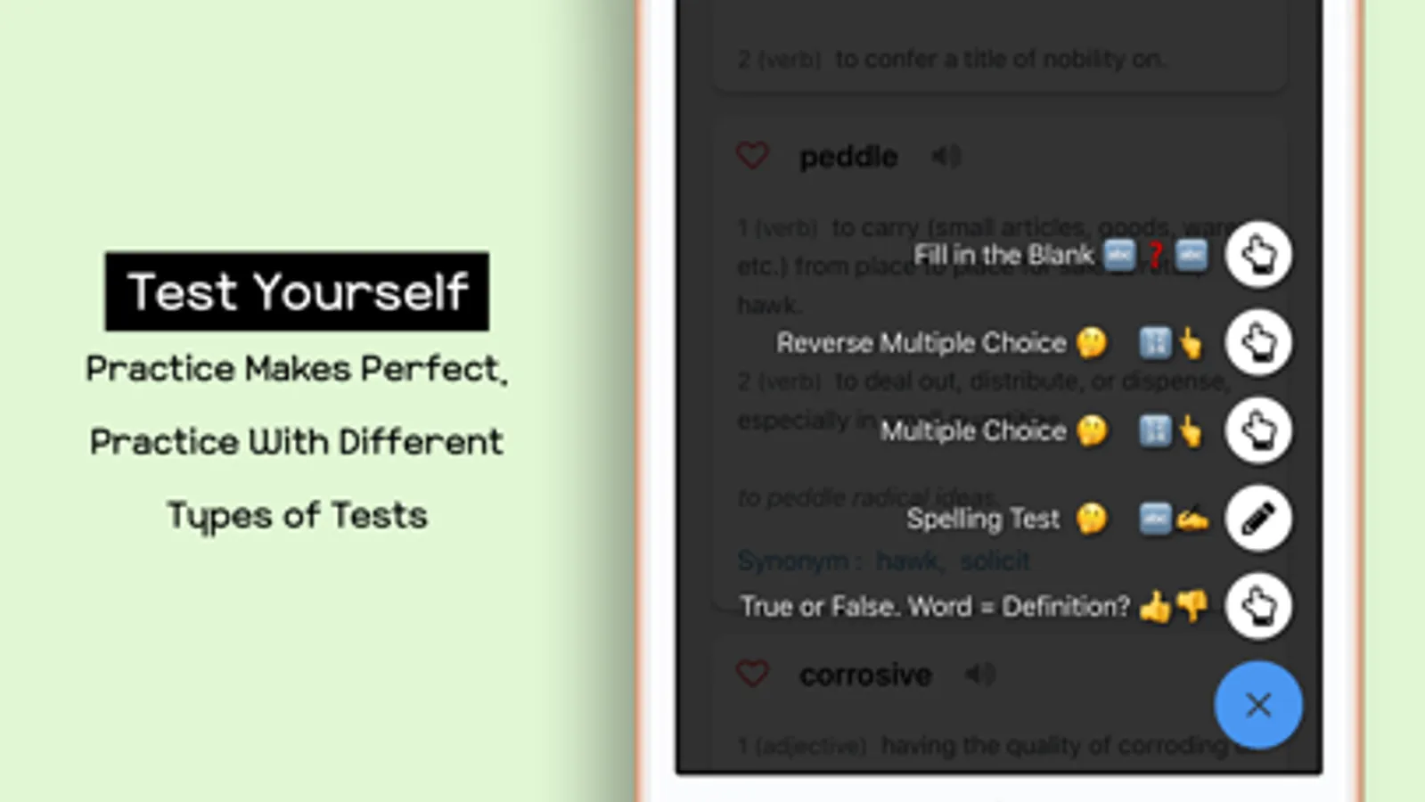 6. MANY TESTS. It’s very important to test if you actually memorize the word or not. So there are multiple tests, spelling test, fill in the blank test and many more to test yourself. When you get a word wrong during these tests, the app will remember that particular word and it will show up on Test Results tab. This tab will keep track of all the words you had hard time remembering.