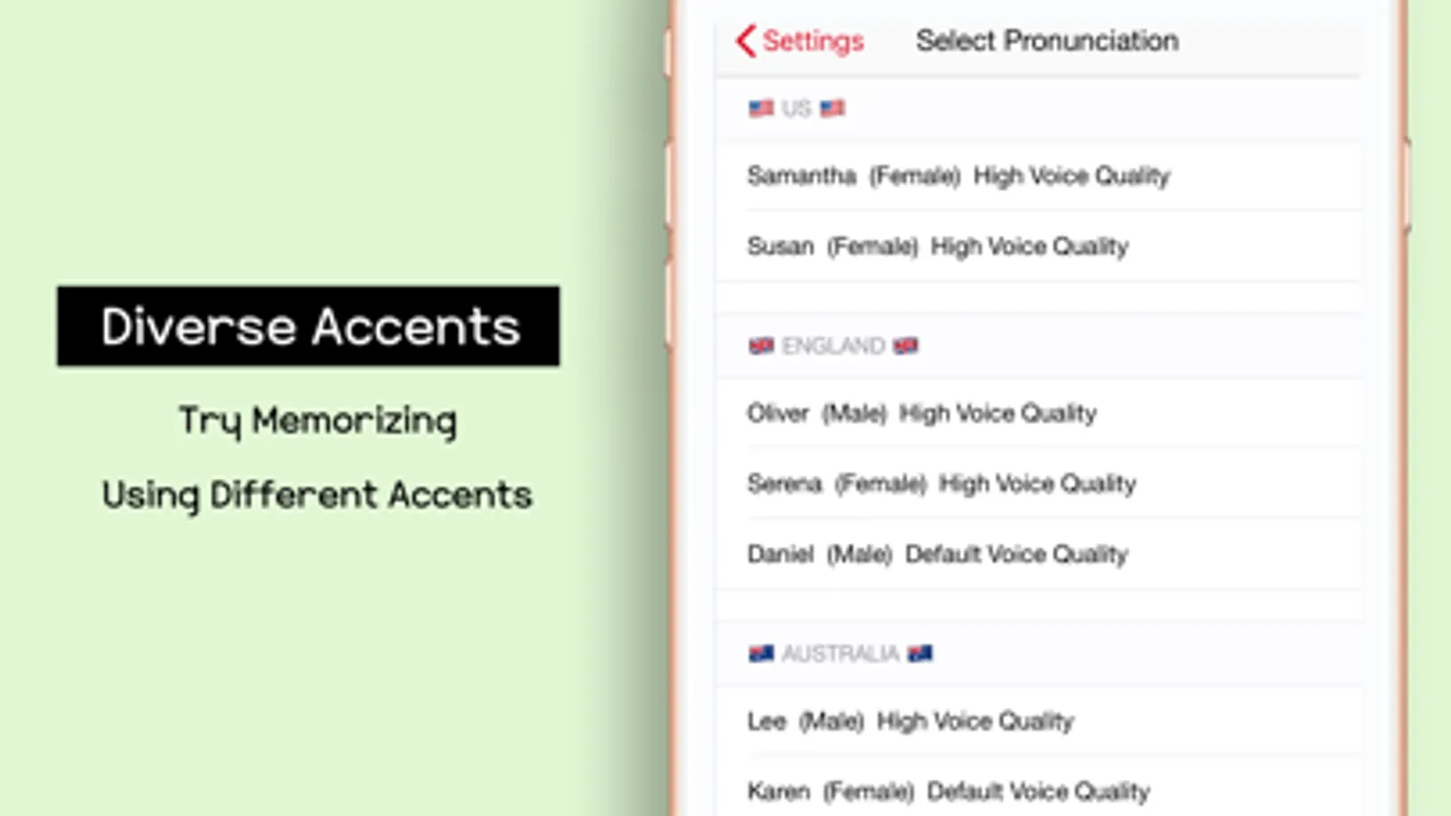 5. DIFFERENT ACCENTS. Since there are many audio related features, and not everyone is located in US, this app makes sure to include other accents like British, Australian, Ireland, and South Africa.