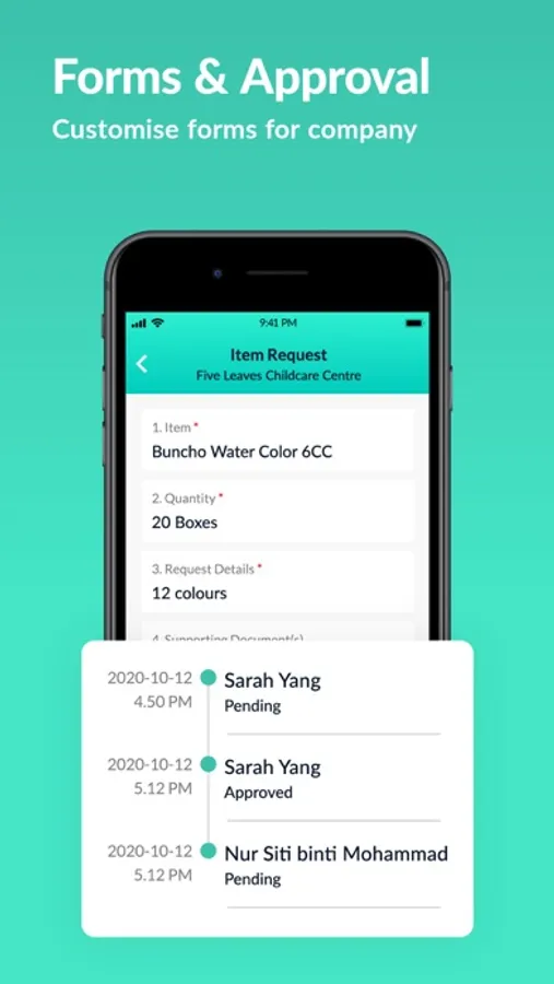 - Employees can use the various forms available such as Leave application, Financial, Project application, Item Requisition and more.