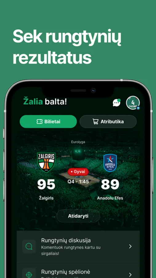 • Negalėsi palaikyti komandos arenoje ar stebėti rungtynių per TV? Sek rungtynių rezultatus ir statistiką gyvai mobiliojoje aplikacijoje.