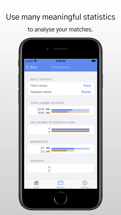 Get detailed info about your shots, games, sets, and matches. Find out about your strengths and what you still need to improve.