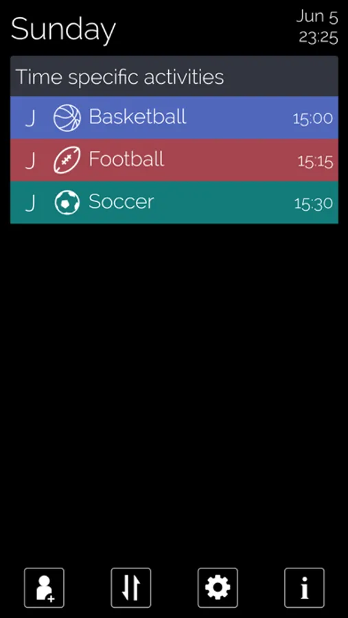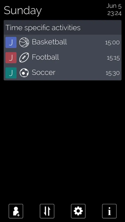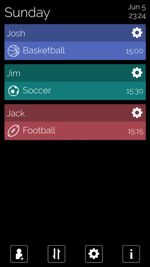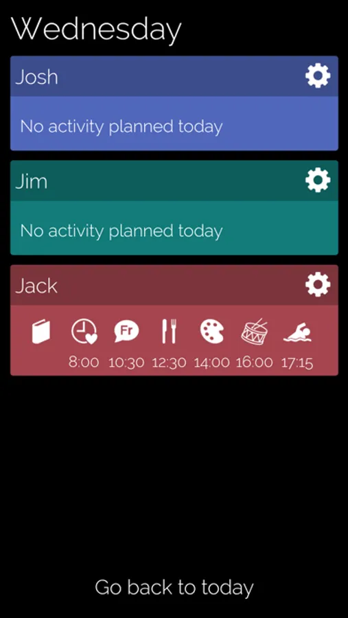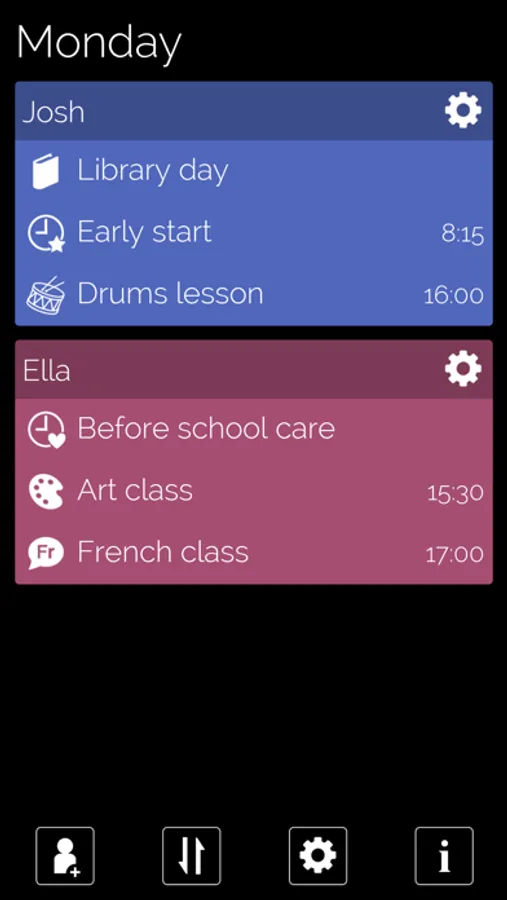We're talking seconds here. For example, if the Karate lesson for Josh changes from 3pm to 4pm, simply tap the settings icon next to Josh's name, click the day, the activity, and select 4pm. Done.