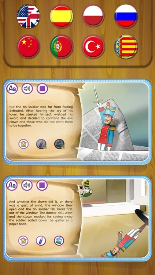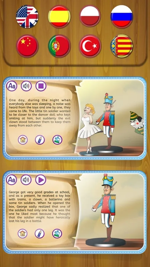 • The story: Read and listen to the story by pressing the audio button to play the sound. The audio is available in English, Spanish, Chinese, Polish, Portuguese, Russian, Valencian and Turkish, accompanied by beautiful background music and sound effects.