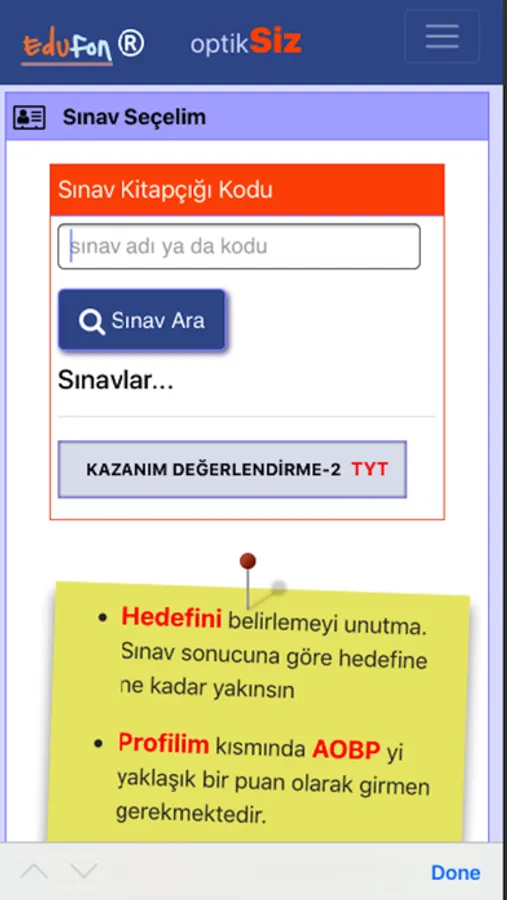 sınav setinin arkasındaki kodu girerek veya listeleyerek sınavı seçip telefondan işaretlemeyi yapın.