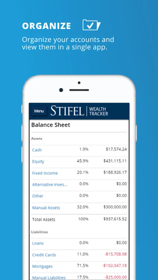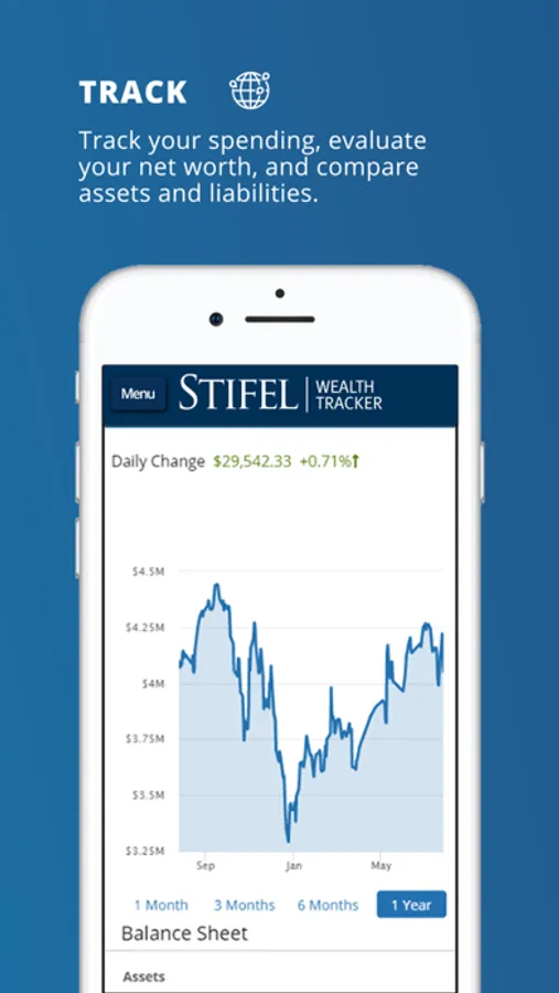 Available via mobile, tablet, or any computer, Stifel Wealth Tracker is a powerful free service designed to give you a big-picture view of your financial situation so that you can chart a course for your future. Use Wealth Tracker to securely view all of your financial information – your investment and retirement accounts, checking and savings accounts, mortgage, student loans and other loans, credit cards, and more – in one place. The software will track your net worth, monitor your progress toward your goals, perform detailed analysis on your investment portfolio and illustrate your asset and sector allocations. When you register for Wealth Tracker, you can complete a risk profile and see if your holdings are aligned with your financial goals, tolerance for risk, and time horizon. Additionally, the application can help you better understand certain investments through access to research reports from our nationally recognized equity research partner. Best of all, as an Wealth Tracker user, personal service is only a click away - whenever you have questions or need assistance, Wealth Tracker can connect you to a Financial Advisor in your area.