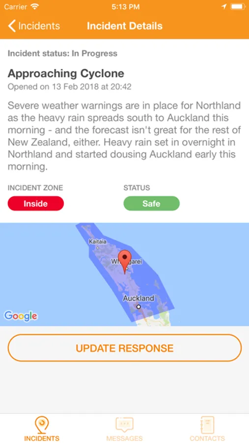 The app uses location data to alert users of an incident in the area and prompt them to confirm whether they are safe or in danger. Messages can be sent to individuals or groups via the app, providing advice, information and regular updates. Emergency contacts can also be viewed in-app if further assistance is required.