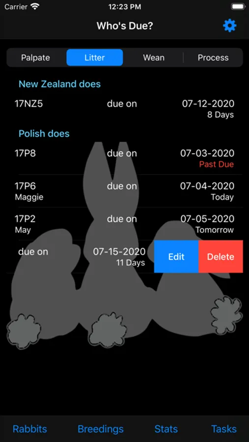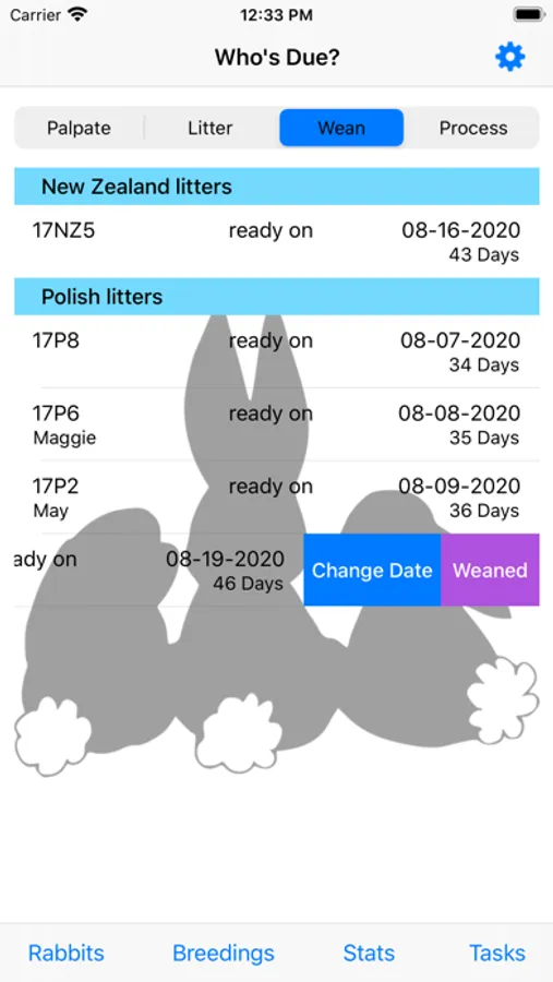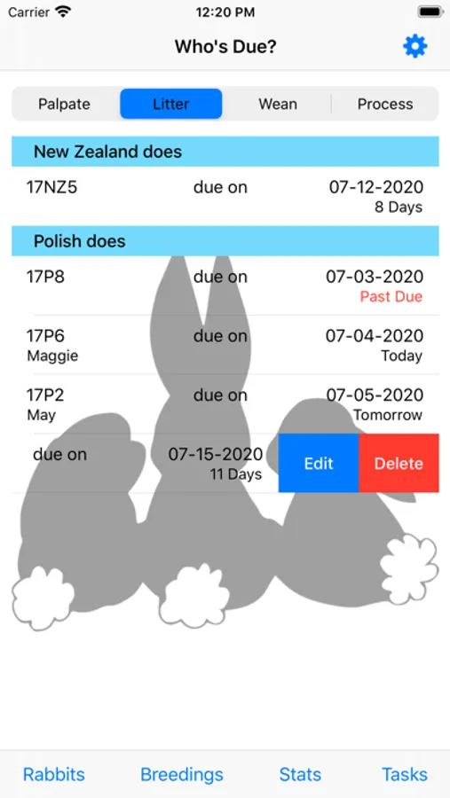 • See a list of who’s due to have a litter, which rabbits are due to be palpated, and which rabbit litters are due to be weaned or processed sorted by due date and grouped by Breed on the main screen.