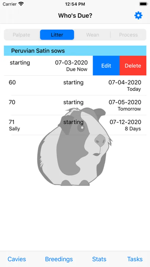 • Get a notification for cavies that they are due at the beginning of the gestation range for cavies.