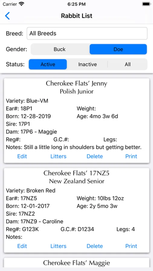 • View all the animals you have of a breed grouped by gender. Easily toggle the view to show inactive rabbits and cavies or all rabbits and cavies instead of only active ones.