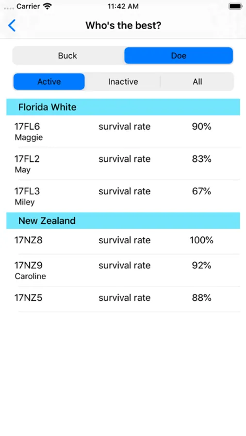 • Quickly and easily see the survival rate or largest litter size of all animals of a breed ordered from highest to lowest. Tap a row to bring up the litter record for that animal to see the full details of all its litters. Easily toggle the view to show inactive rabbits and cavies or all rabbits and cavies instead of only active ones.