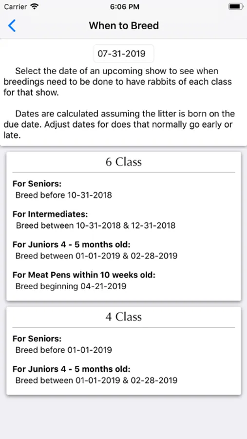 • Use the date calculator to find out when breedings need to be done to have each class of rabbit for a show. Just enter the date of the show and the dates are calculated for all classes.