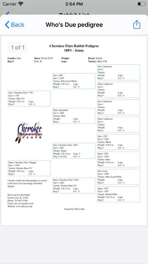 • Print a pedigree in portrait or landscape orientation including custom logos from the rabbit/cavy list.