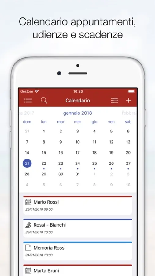 - Inserisci e salva evento (appuntamento, udienza o scadenza), con aggiunta di note, foro, curia, giudice ed R.G., ed imposta una notifica per essere avvisato al giorno ed ora desiderati.