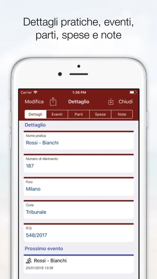 - Aggiungi e salva nuova pratica, con numero di riferimento, foro, curia ed R.G., eventi correlati (appuntamenti, udienze e scadenze), parti e controparti, entrate ed uscite, ed eventuali note.