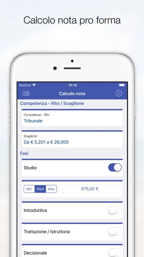 - Seleziona fase di studio, introduttiva, di trattazione, decisionale e cautelare, selezionando i valori minimi, medi o massimi, oppure inserendo un valore a piacimento.
