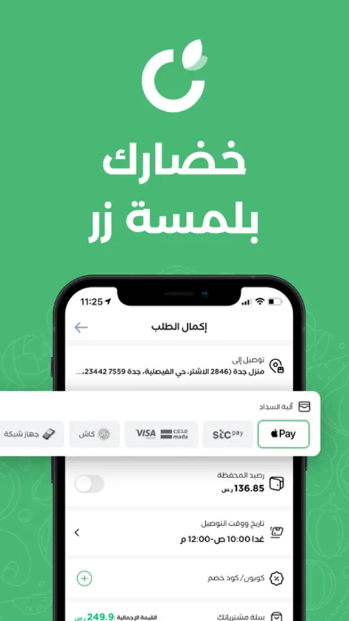 - يوفر التطبيق طرق سهلة ومريحة للدفع فيمكنك الدفع نقداً أو باستخدام بطاقتك الائتمانية. يمكنك أيضاً الدفع من خلال 'مدى' عند وصول المندوب إليك