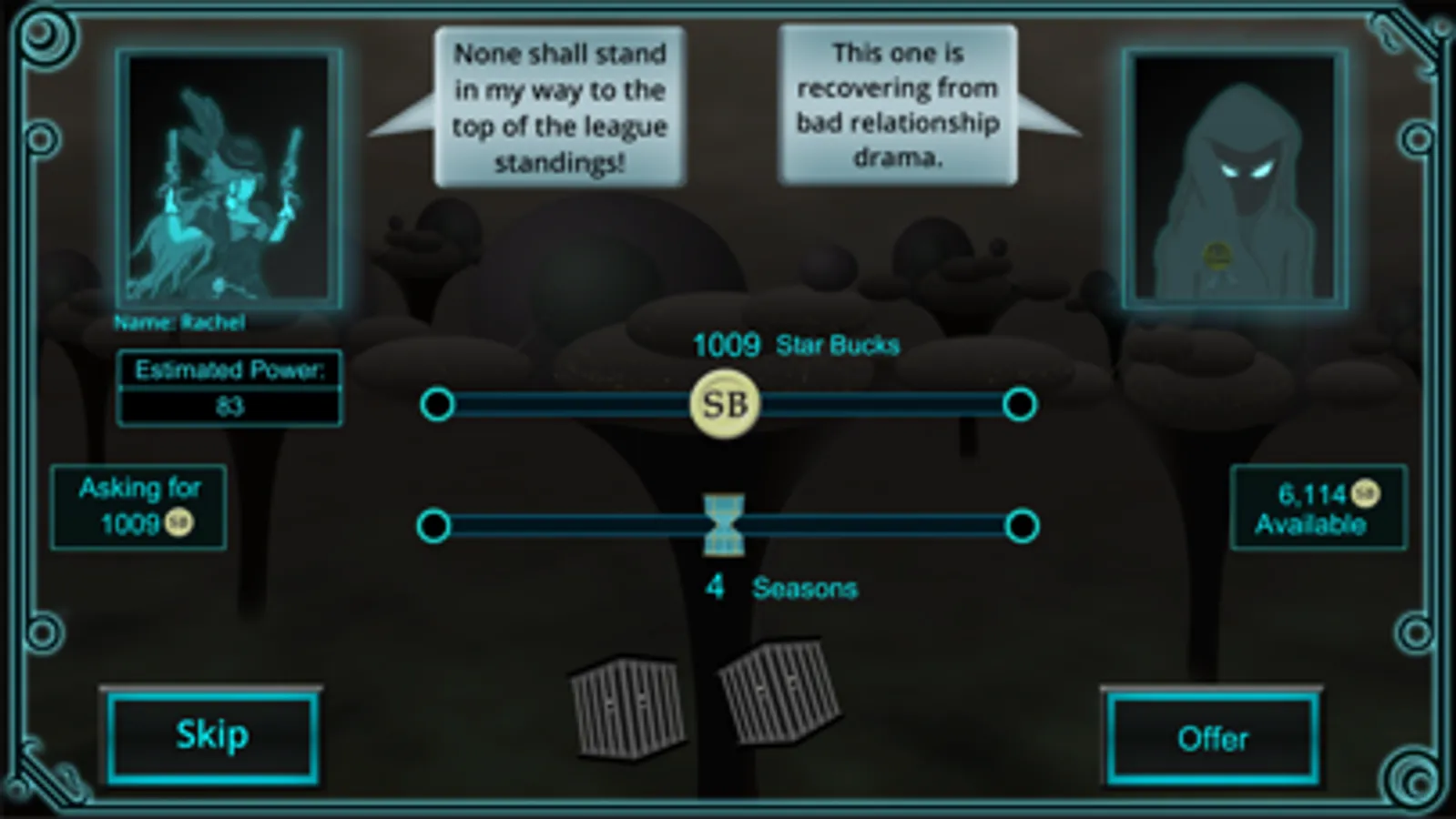 Space Leagues is a fantasy management game that has a unique art style, in depth lore and over 120 unique characters with evolving personalities. Your job is to recruit and manage a team of fighters that will compete in a gladiator style league system. You will need to balance the wages for your team, negotiate contracts and place each fighter into one of five positions. Battles are real time and each fighter will make their own decisions during combat. Your fighters will be graded on how well they perform. Win your league and be promoted, maybe even earn a few awards at the end of the season. Lose and… well, just don’t lose.