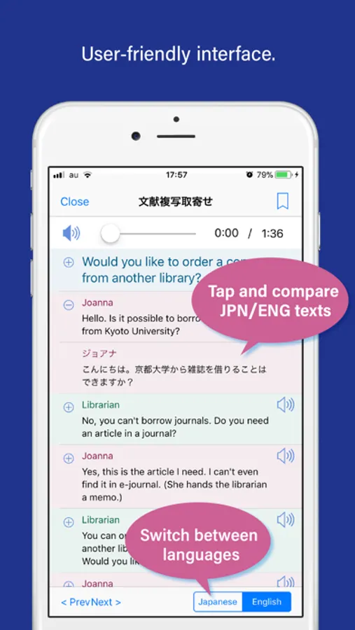 • Tap and compare JPN/ENG texts side by side.