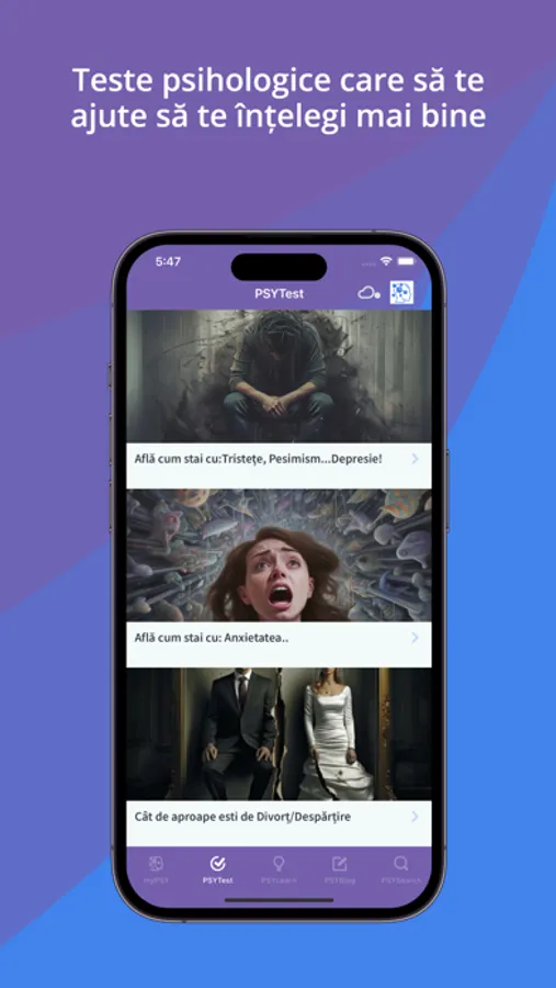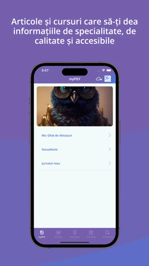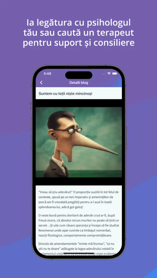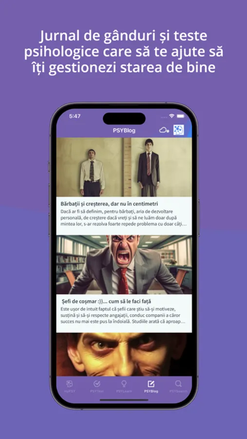 Aplicație dedicată PSIHOLOGIEI destinată atât publicului larg, companiilor cât și specialiștilor, care cuprinde informații de bază despre aproape toate afecțiunile de natură psihologică. În plus, aplicația oferă posibilitatea de a contacta psihologi, de a te programa, de a citi minime informații despre ei si despre locul unde profesează, de a pune întrebări și de a primi un răspuns la întrebările tale. Este locul unde vei primi direct articole de specialitate, informații media: video-audio, website-uri de specialitate și cursuri la care să participi.