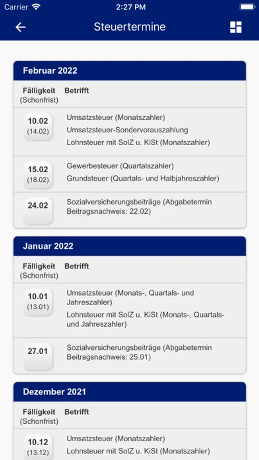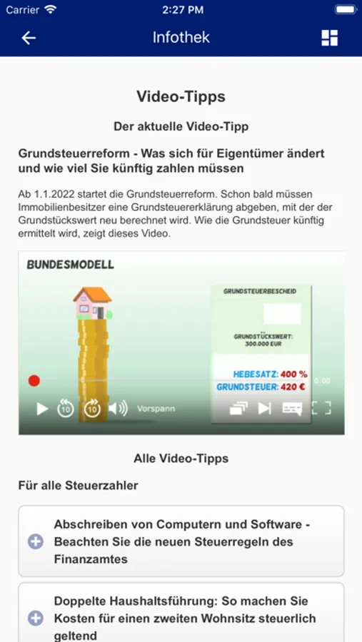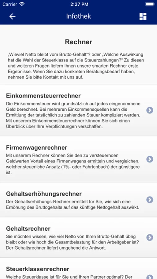 Zu Ihren ersten ausgewählten steuerrechtlichen Fragestellungen hält die App Informationen bereit: Was ist bei der Führung eines Fahrtenbuchs zu beachten? Welche Möglichkeiten steuerbegünstigter Gehaltszuwendungen an Arbeitnehmer gibt es?