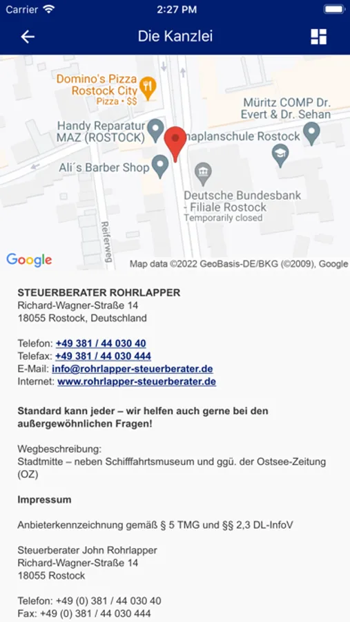Natürlich haben Sie mit dieser App auch immer einen direkten Draht zur Kanzlei. Sämtliche Kontaktdaten inkl. komfortabler Wegbeschreibung stehen darin zur Verfügung. Sollten Sie Telefonnummer oder E-Mailadresse mal nicht zur Hand haben, schlagen Sie einfach in der App nach.