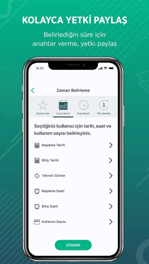 Onlock mobil uygulaması üzerinden anahtarını istediğin kişiyle anında paylaşabilirsiniz. İster bir saat aralığı, istersen belirli gün ve zamanlarda anahtar kullanma yetkisi verebilirsiniz. Kilidin asıl sahibi olarak paylaştığın anahtarı anında iptal edebilir, eşyalarını güvenle koruyabilirsiniz.