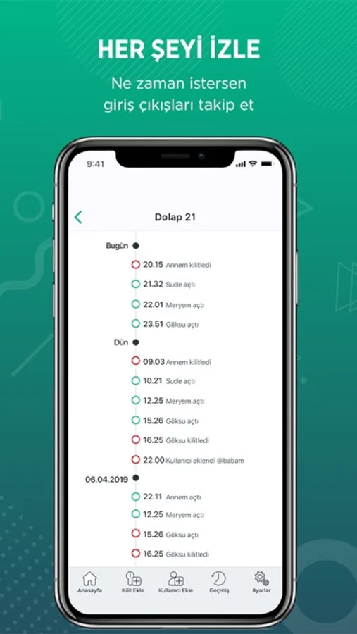 Onlock mobil uygulaması, anahtarını paylaştığın ve kilidi kullanan herkesin kayıtlarını tutar, böylece dakika-dakika çekmece/dolabına kimin eriştiğini görüntüleyebilirsiniz.