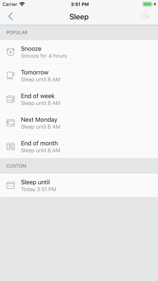 • Task scheduling options that allow you to manage your tasks based on a schedule that works for you. Postpone a task until sometime in the future, whether it’s tomorrow during your morning coffee, or next week after your big status meeting.
