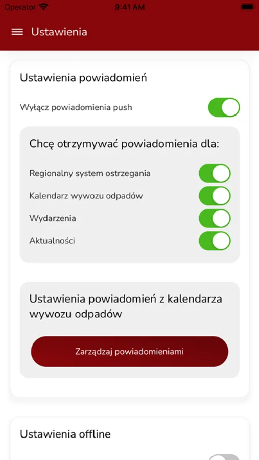 - systemu powiadomień push, abyś mógł otrzymywać ostrzeżenia kryzysowe, przypomnienia o wystawieniu pojemnika z odpadami czy powiadomienia o ważnych aktualnościach