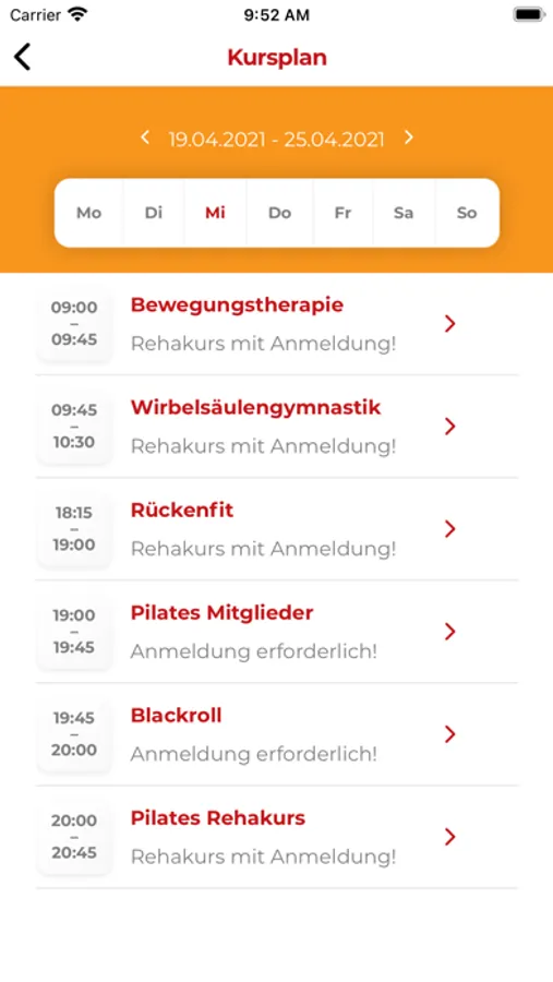 Den aktuellen Kursplan kannst du jederzeit über die App abrufen, somit bist du immer informiert, wann die Kurse beginnen. Du wirst nie wieder deinen Lieblingskurs verpassen.